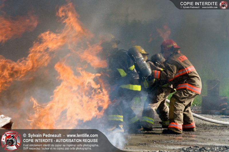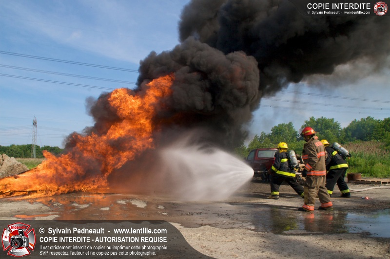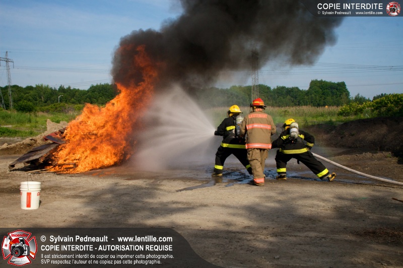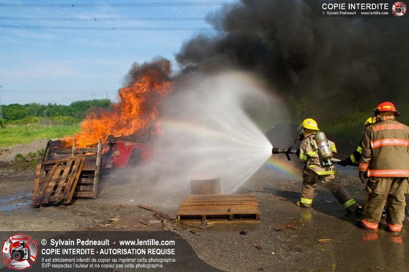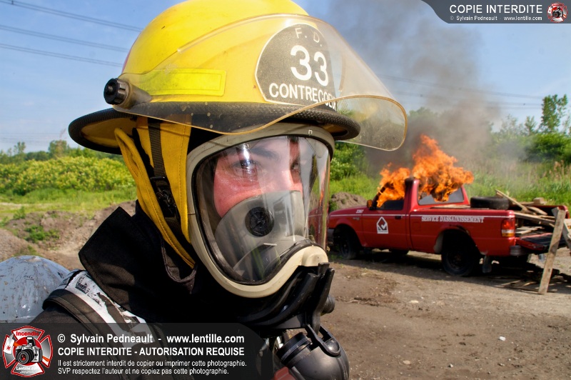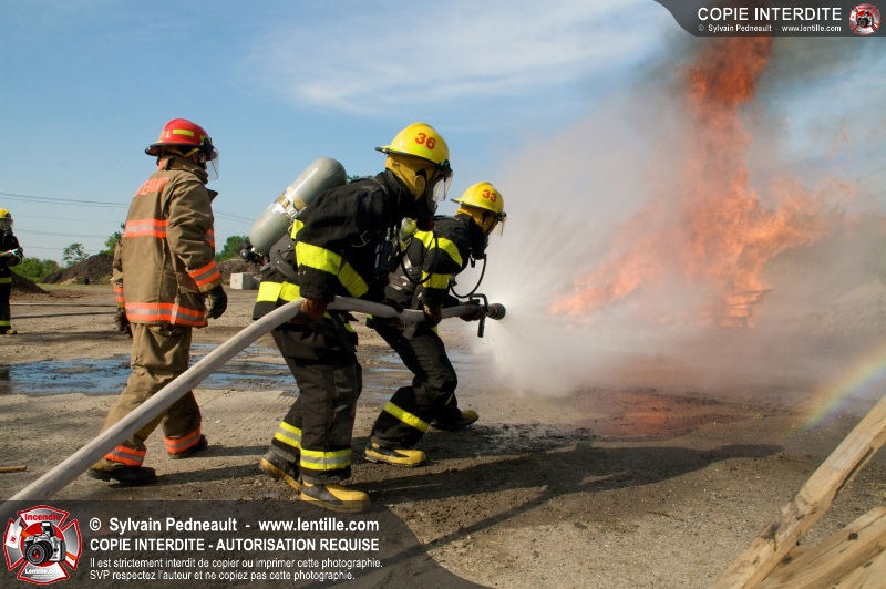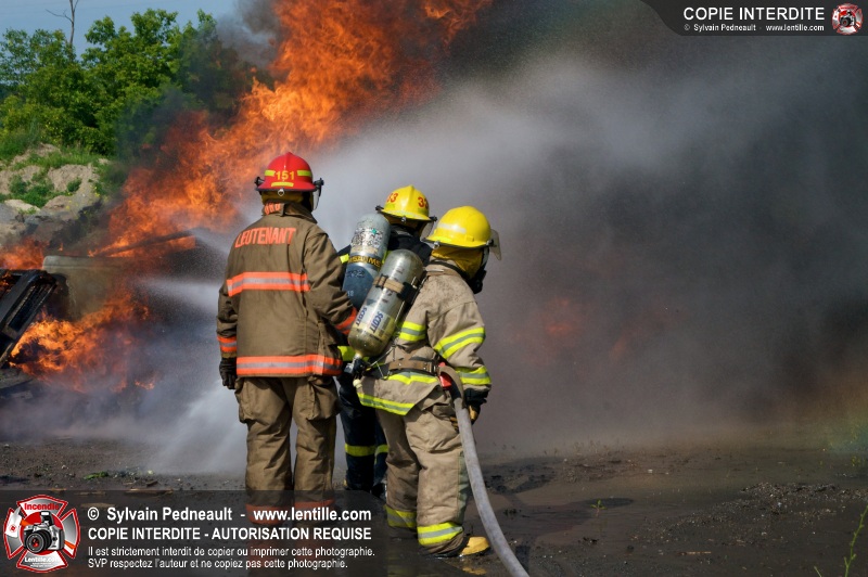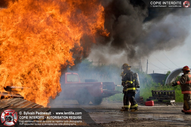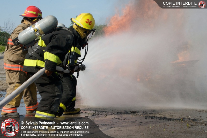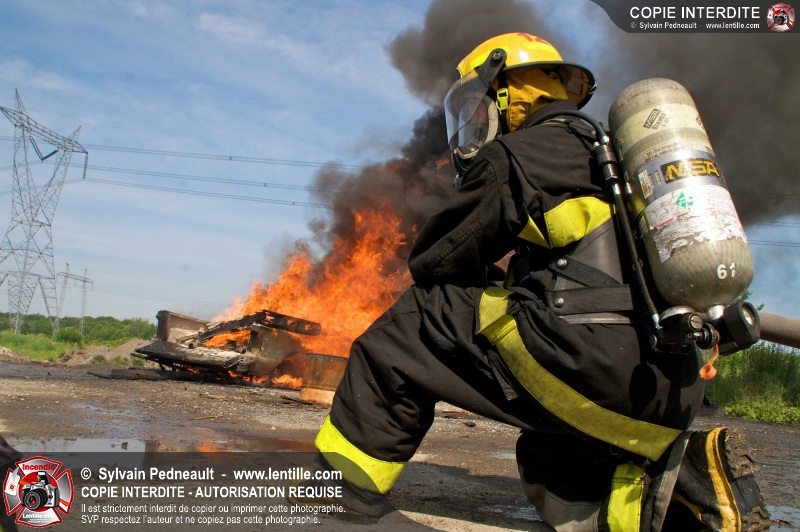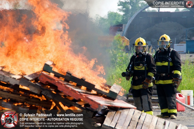 Des pompiers en formation à Contrecoeur ont participé à une pratique d'incendie. Des palettes de bois et un véhicule ont été utilisés pour permettre aux étudiants de pratiquer différentes manoeuvres d'intervention.
