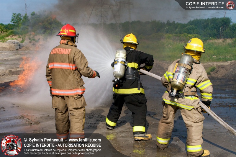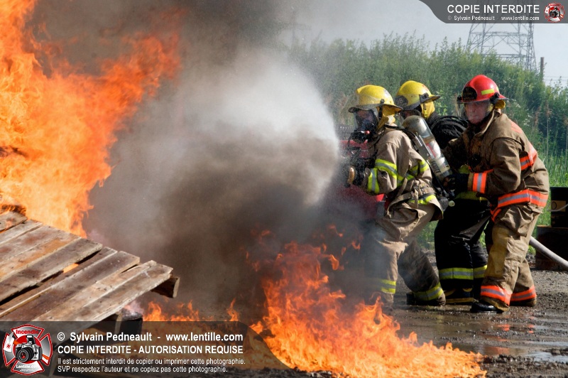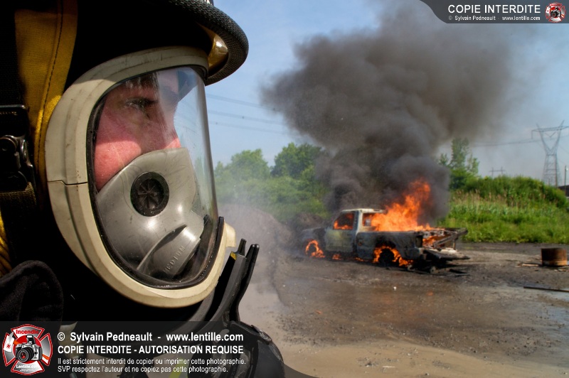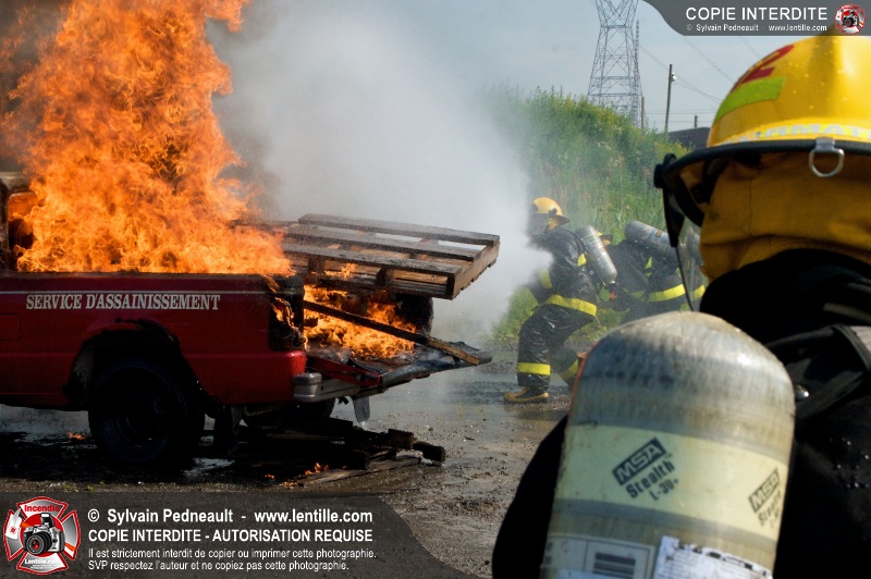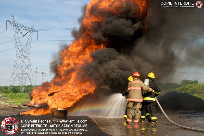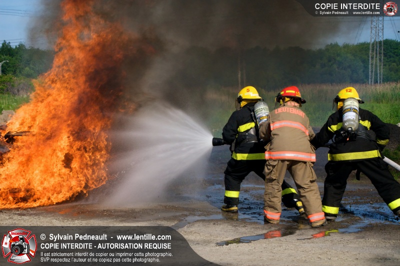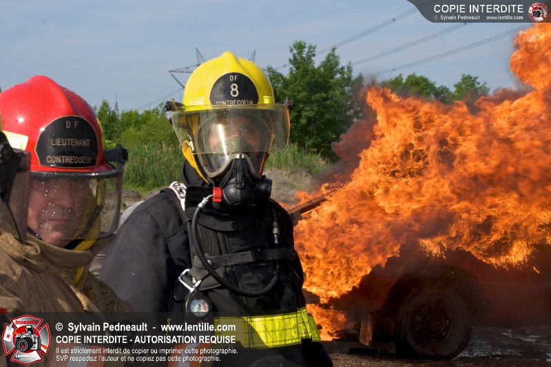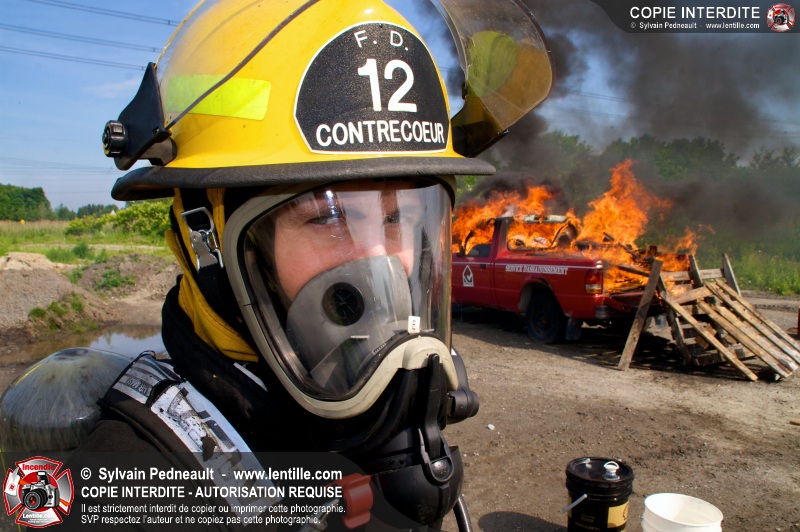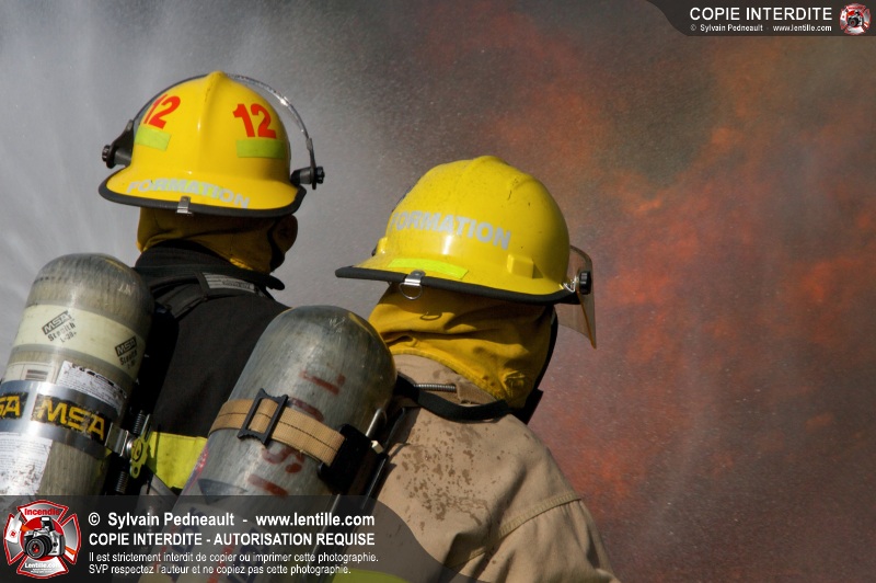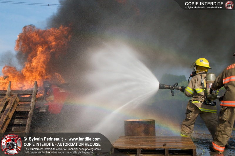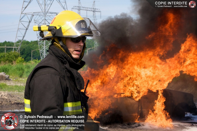 Des pompiers en formation à Contrecoeur ont participé à une pratique d'incendie. Des palettes de bois et un véhicule ont été utilisés pour permettre aux étudiants de pratiquer différentes manoeuvres d'intervention.