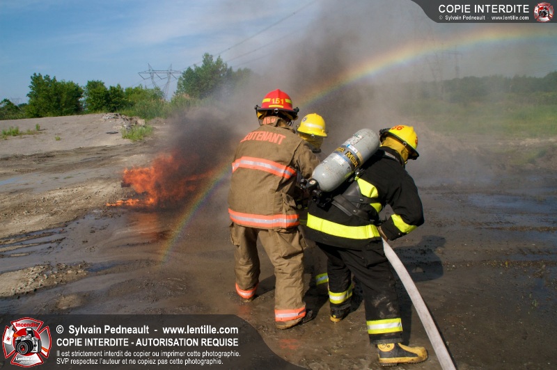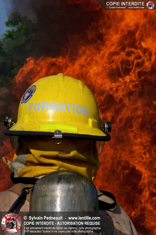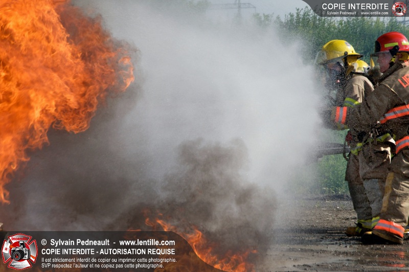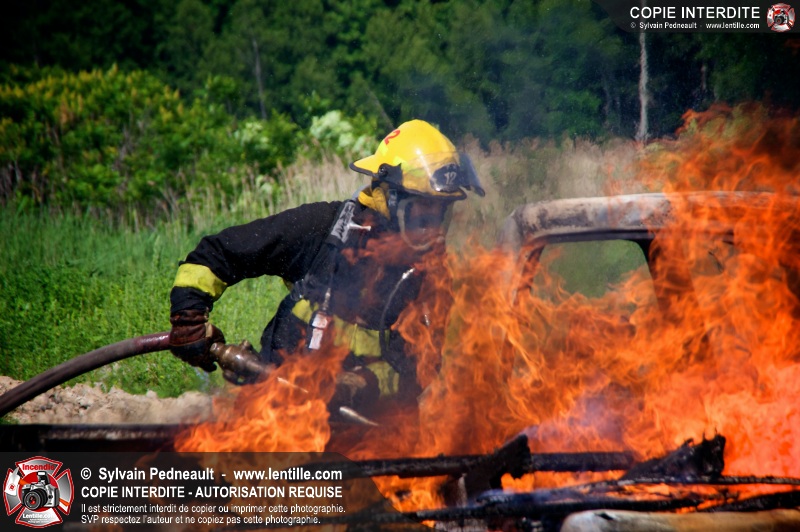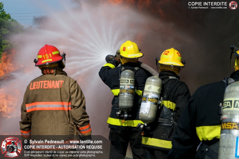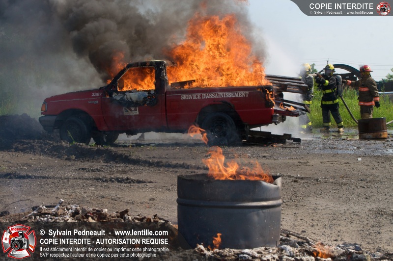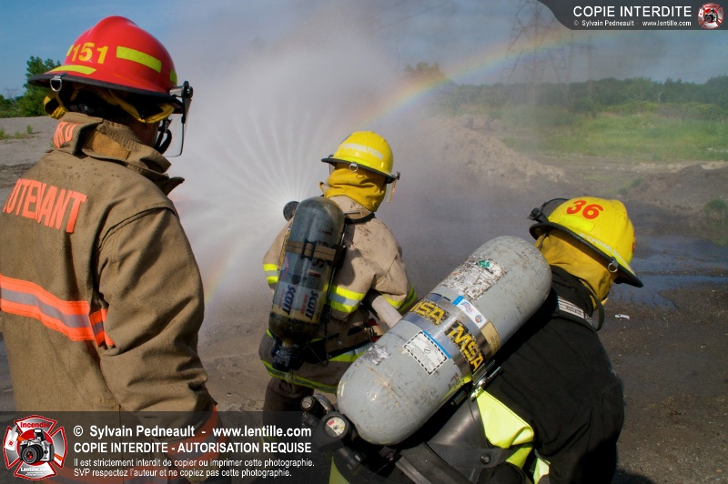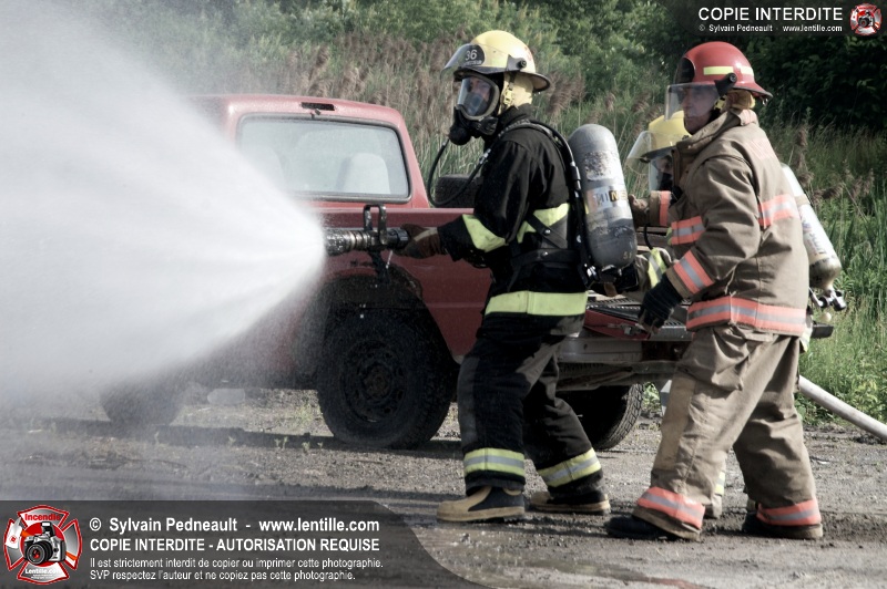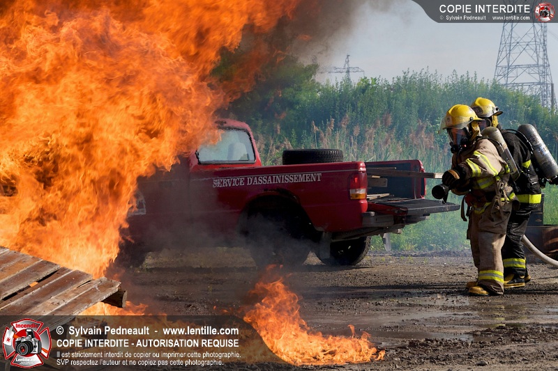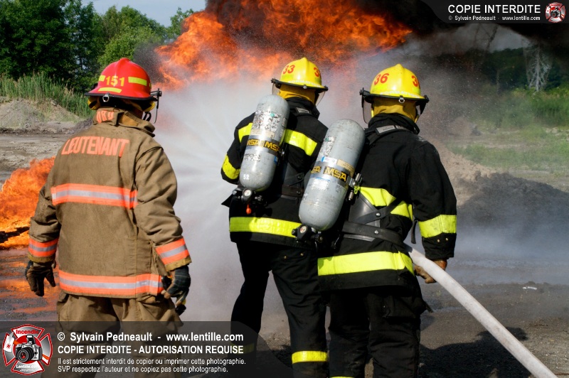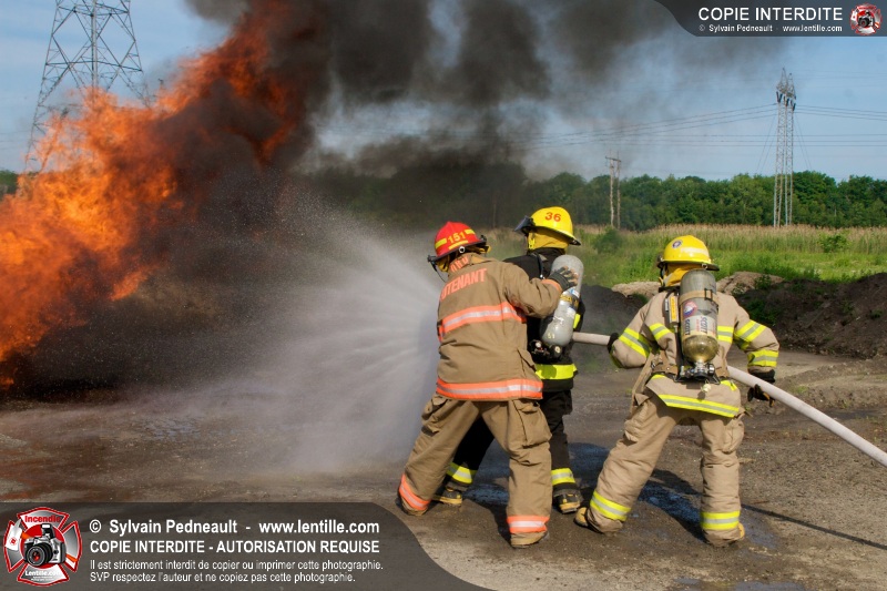 Des pompiers en formation à Contrecoeur ont participé à une pratique d'incendie. Des palettes de bois et un véhicule ont été utilisés pour permettre aux étudiants de pratiquer différentes manoeuvres d'intervention.